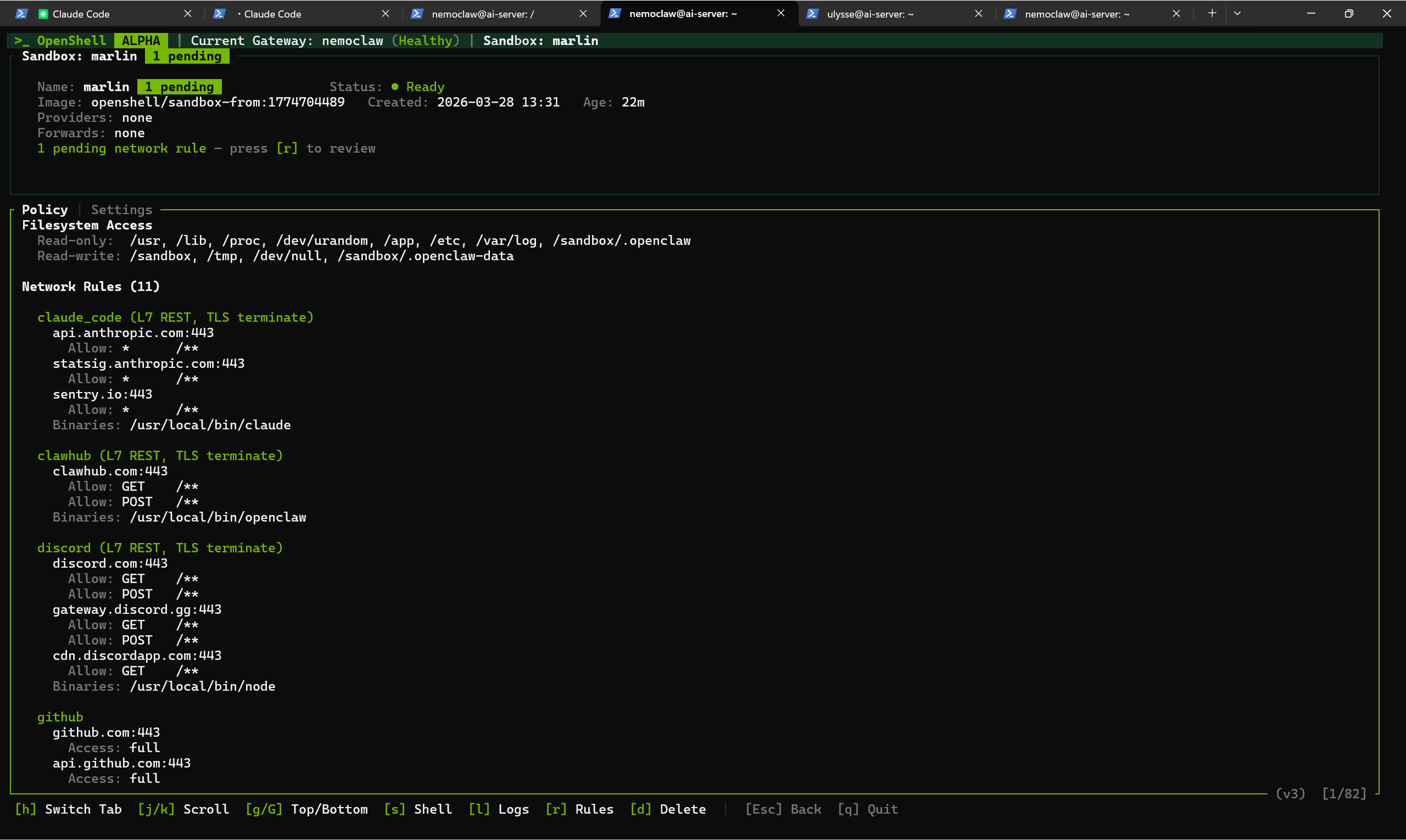 Finally, Guardrails control what the agent is allowed to reach. The most important concept here is default-deny networking: the agent starts with zero access to the outside world. Every service it needs to connect to (Discord, GitHub, Telegram, a client’s API) has to be explicitly listed in a policy. Anything not on the list is blocked and logged. You can review blocked requests in a live dashboard and decide whether to approve them.