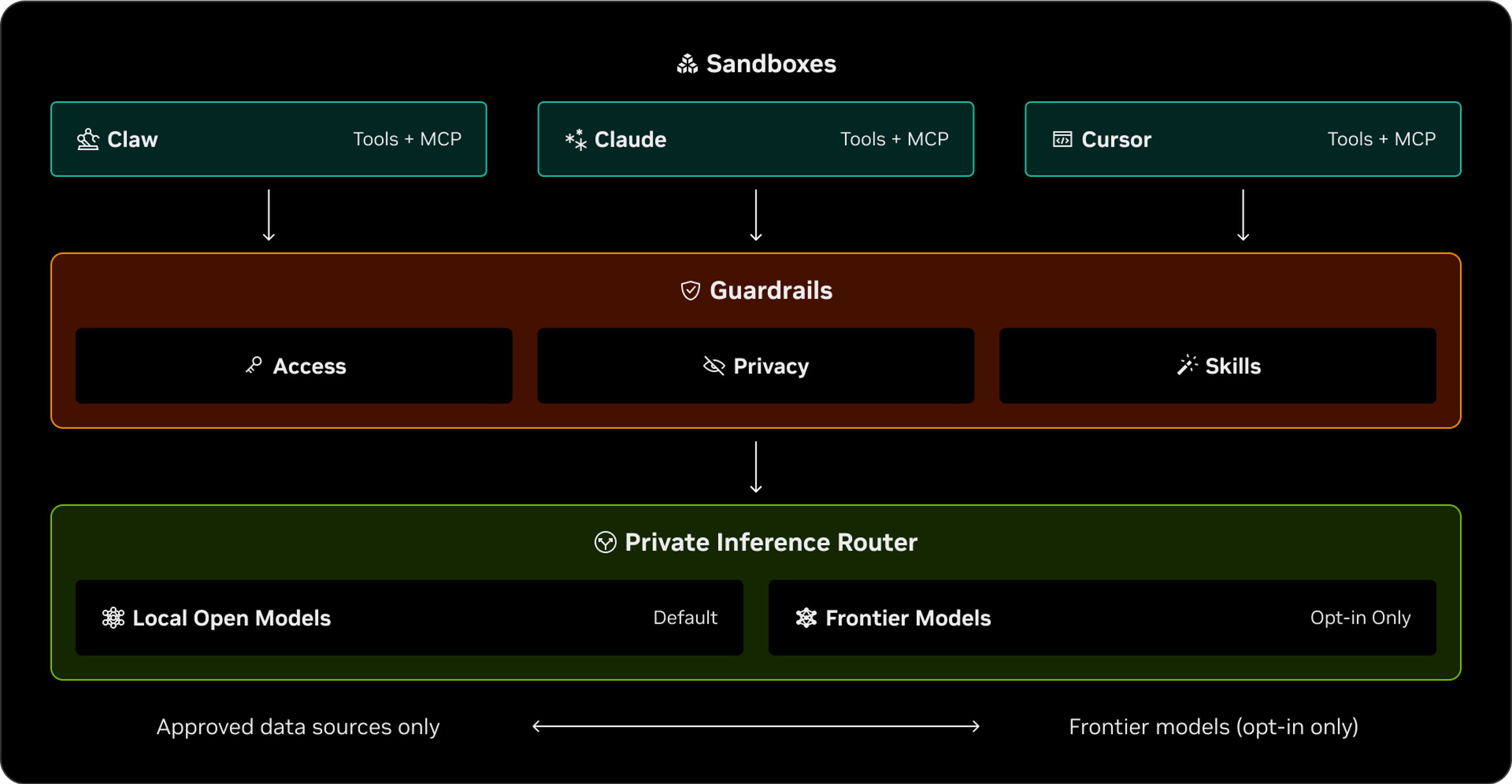 The private inference router handles how the agent communicates with its language model (the AI that generates its responses). Your API keys never enter the sandbox. They stay on the host machine, and the gateway routes requests through a secure proxy. Even if the sandbox is compromised, your credentials stay protected.