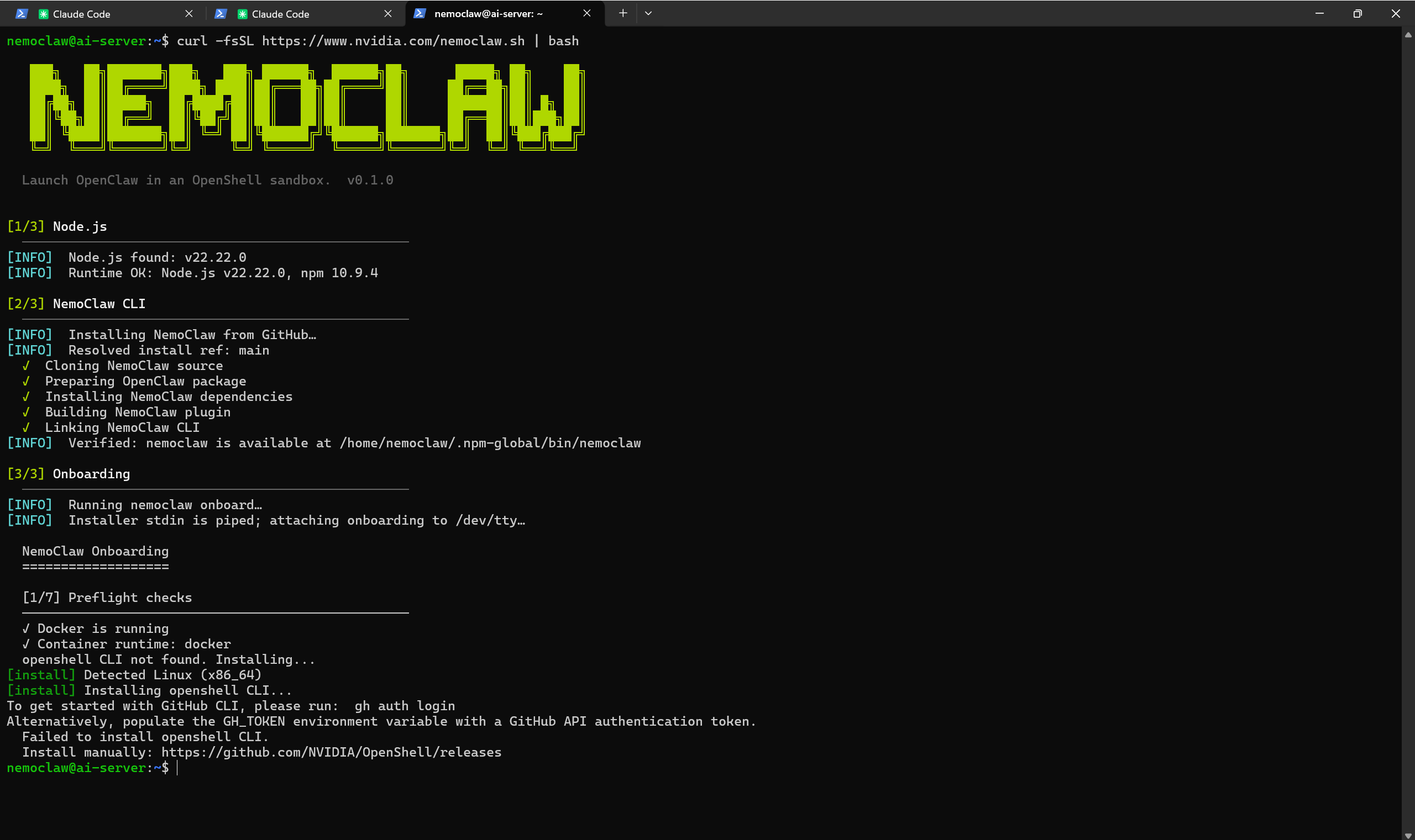 I would like to install NemoClaw on this server to run a sandboxed OpenClaw agent. Walk me through: (1) creating a dedicated Linux user for NemoClaw with proper permissions and Docker access, (2) checking for port conflicts on ports 8080 and 18789 and resolving them if needed, (3) installing NemoClaw via the official installer (curl -fsSL https://www.nvidia.com/nemoclaw.sh | bash), (4) resolving any issues during installation (the OpenShell CLI may fail to install automatically). Once the installation is complete, tell me to run nemoclaw onboard so I can configure the sandbox interactively.